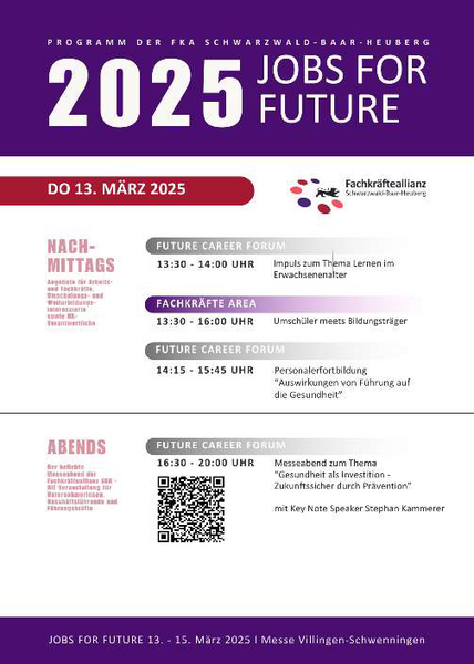 Die Fachkräfteallianz Schwarzwald-Baar-Heuberg hat plant auf der regionalen Messe für Aus- und Weiterbildung umfassende Angebote, um allen Besuchergruppen ein strukturiertes und fokussiertes Messeerlebnis zu bieten. Ein besonderes Highlight des Programms: zwei praxisnahe Fortbildungsworkshops speziell für Personalverantwortliche, die die aktuellen Herausforderungen in der Arbeitswelt adressieren und Lösungen für eine zukunftssichere Personalstrategie bieten.